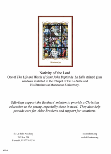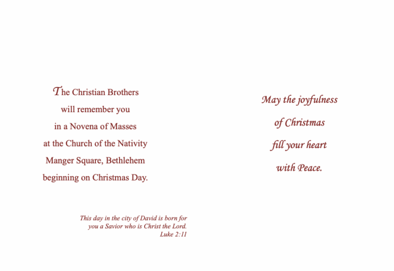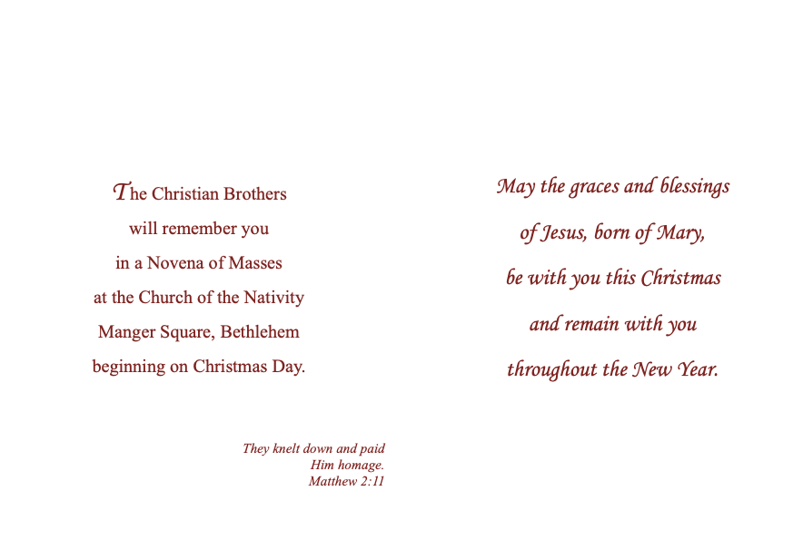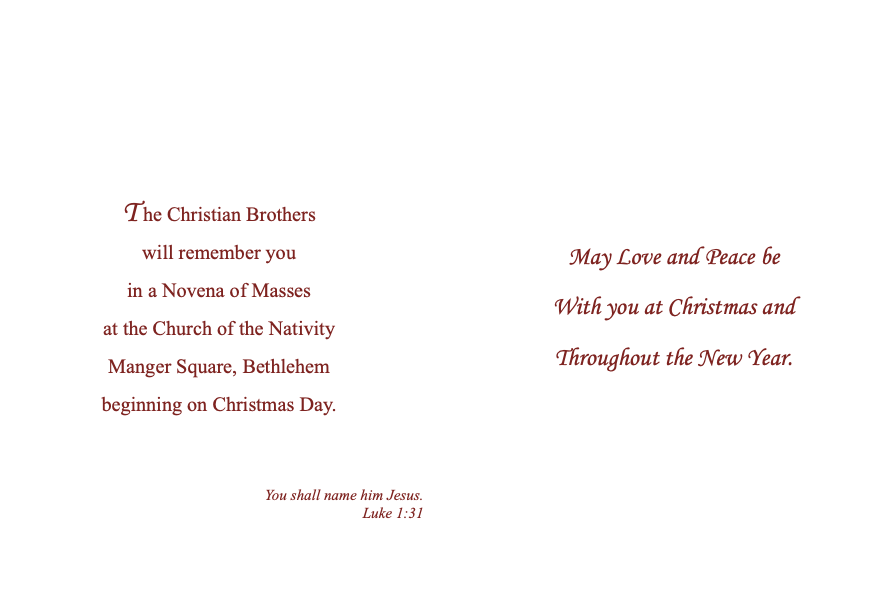 Those enrolled with our Christmas Cards will be remembered at a Novena of Masses for nine consecutive days beginning on Christmas to be celebrated at the Church of the Nativity in Bethlehem.